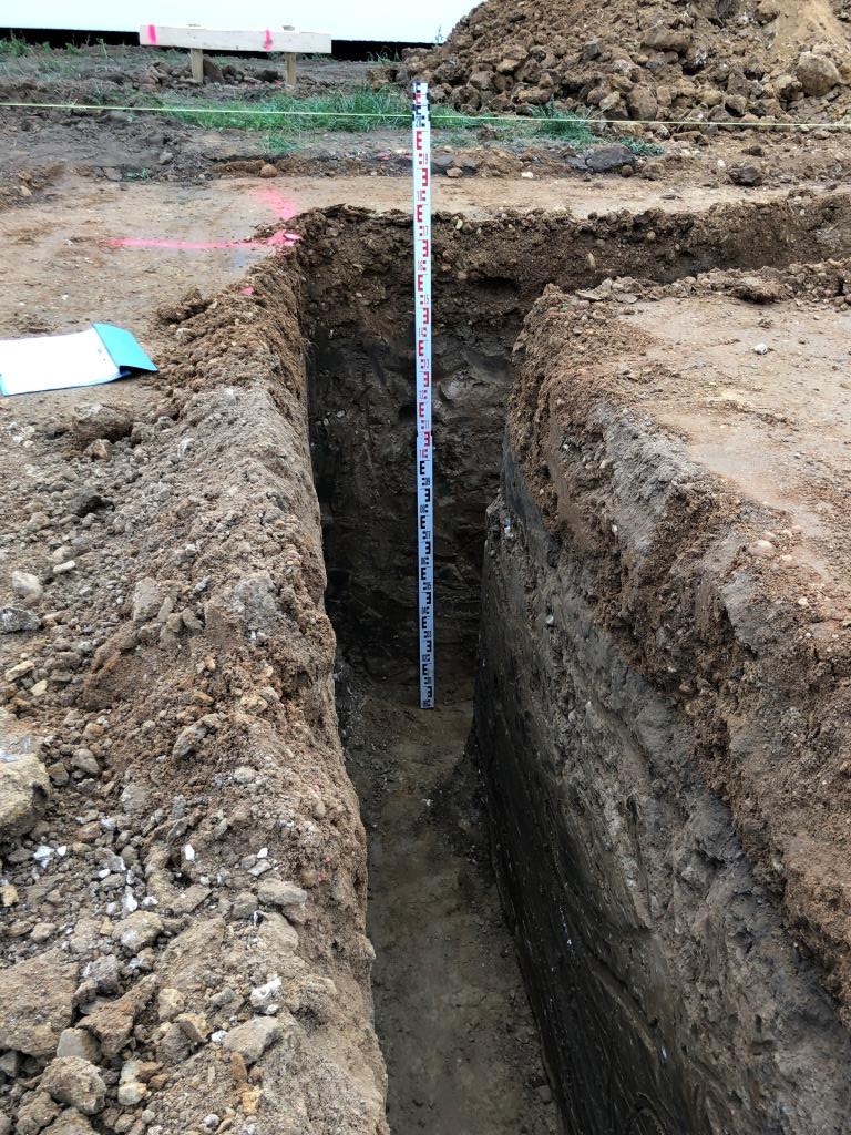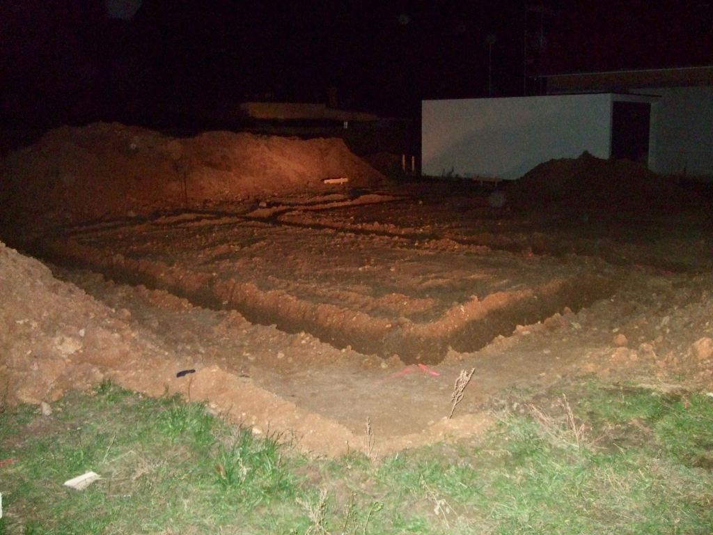 Heute wurde begonnen, die Streifenfundamente auszuheben. Laut Bodengutachten müssen die Fundamente auf einer tragfähigen Sandschicht gegründet werden, die in rund 1,3m Tiefe liegt. An der Südost-Ecke muss man aber sogar bis in 1,8m Tiefe.