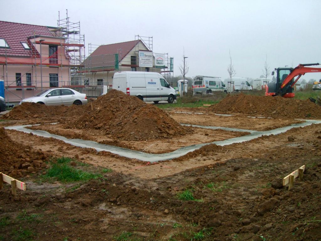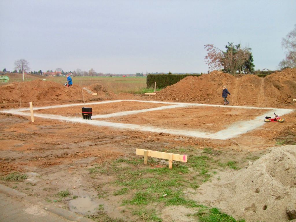 Da der Bagger jetzt wieder über die Fundamente fahren kann, wurde das Erdreich schön glatt gemacht und man kann erstmals die Größe vom Haus ganz gut erahnen: sieht irgendwie klein aus … ich hoffe, das täuscht! 😯