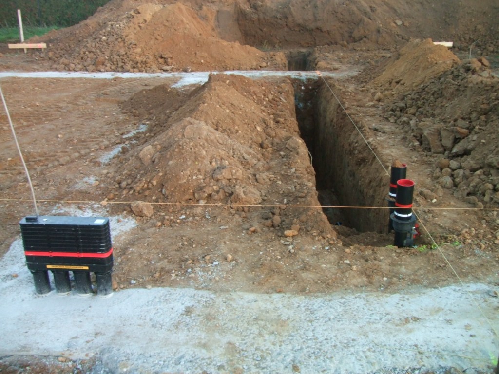 Nachdem die Fundamente getrocknet sind, kann jetzt wieder gebuddelt werden: heute wurden im „Hauswirtschaftsraum“ zwei weitere Einspartenhauseinführungen eingebaut. Über diese soll später die Strom- und Wasserversorgung für den Garten erfolgen.