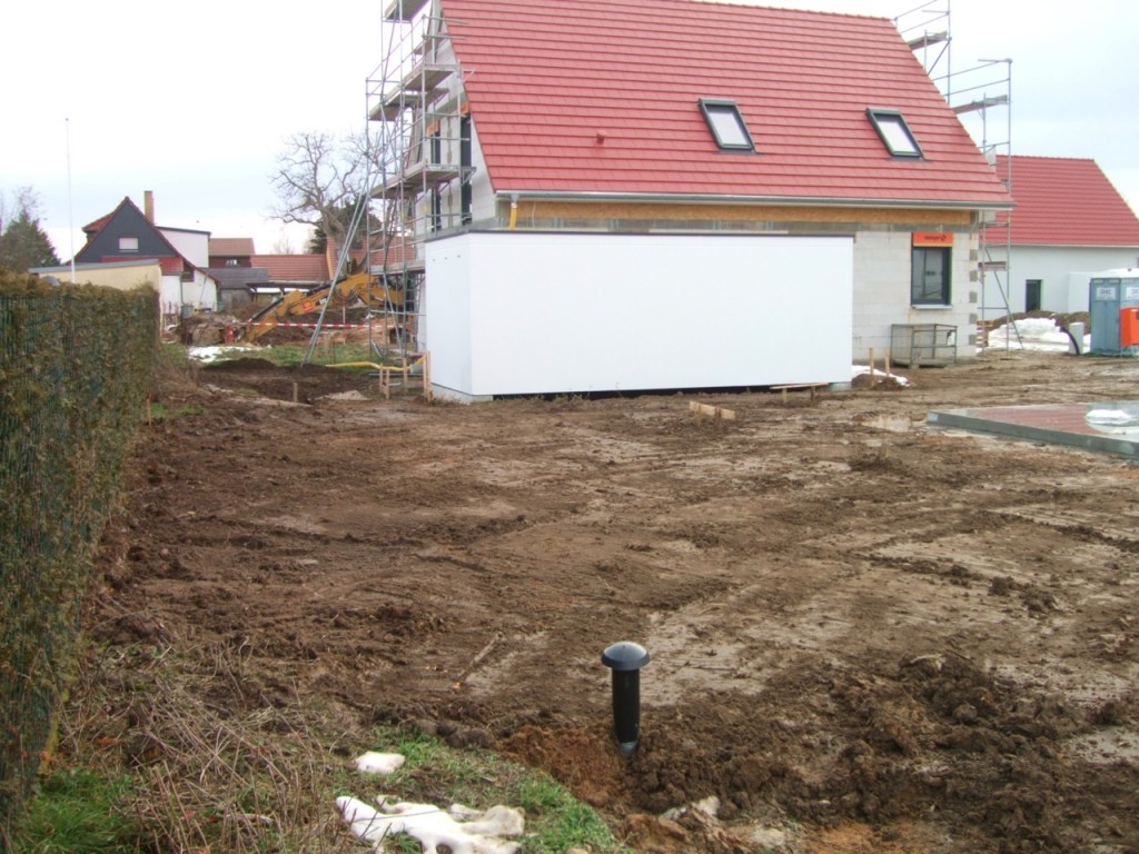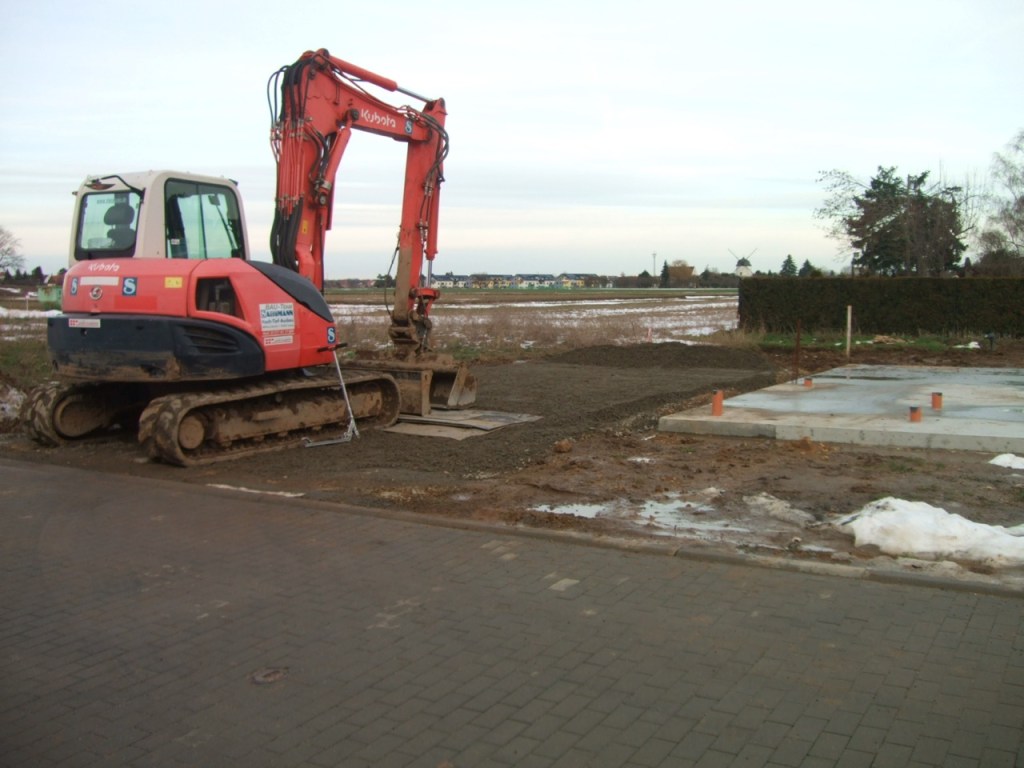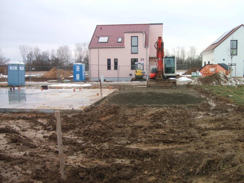 Außerdem wurde mit der provisorischen Baustraße begonnen, die später als Grundlage für die Grundstückseinfahrt dient und die jetzt verhindern soll, dass sich jedes Baufahrzeug im lehmigen Boden festfährt.