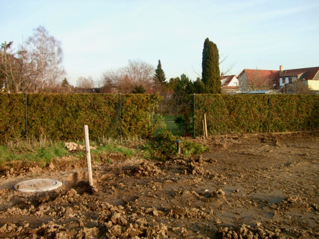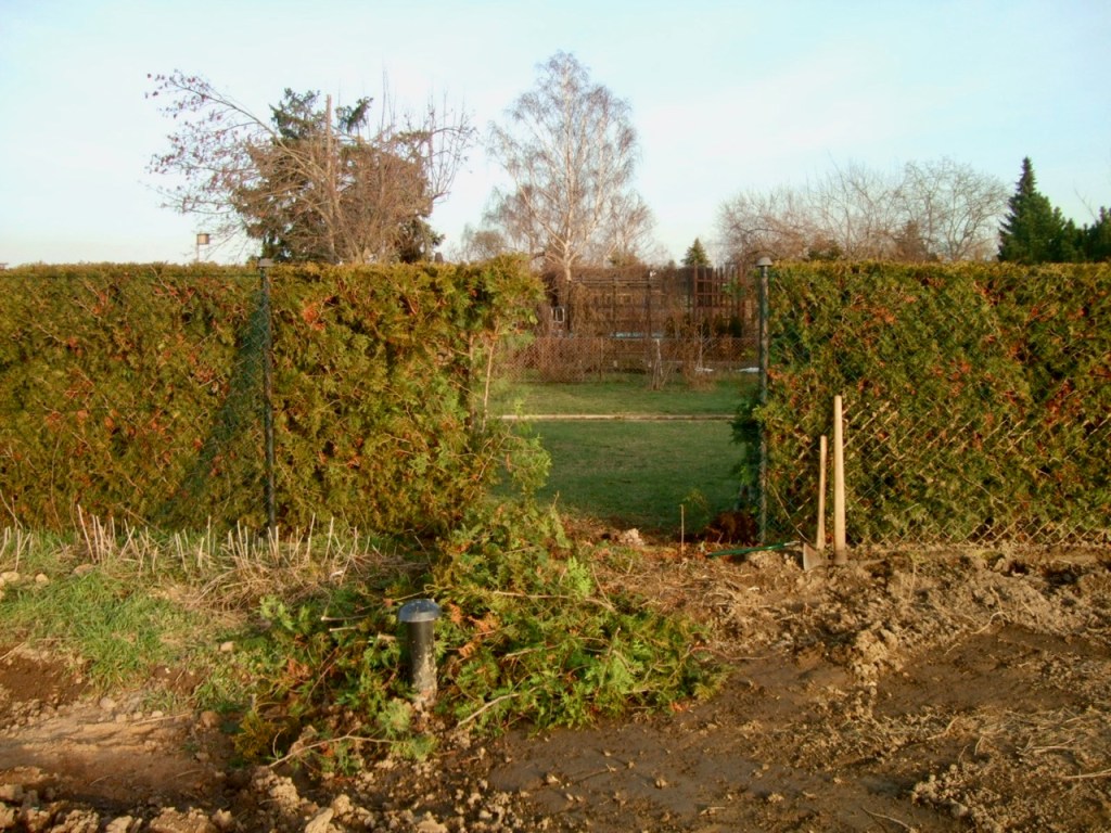 Und wenn wir einmal schon da sind, wird (neben quatschen mit den Nachbarn) heute bei 15°C (letzte Woche waren es noch -15°C) auch gleich der Durchbruch zu Dieters Grundstück hergestellt. Wir haben ja nochmal gut 300qm von unserem Nachbar Dieter abgekauft. Und um aufs Grundstück zu kommen, muss jetzt erstmal ein Stück Thujahecke raus.