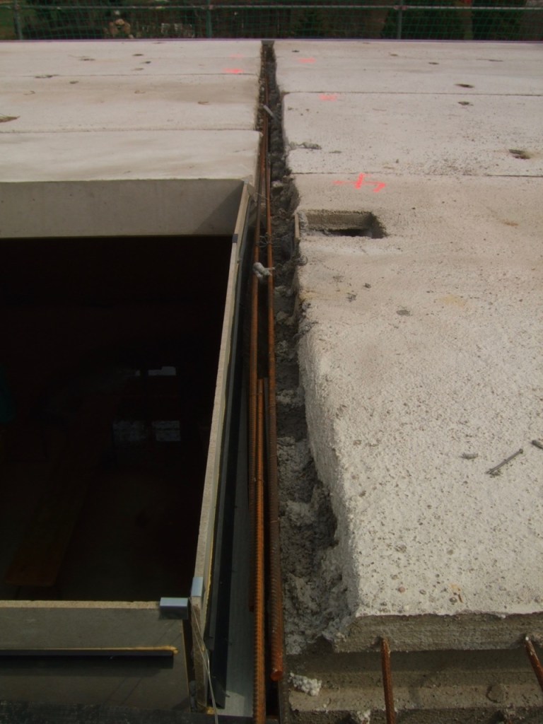 Auch zwischen die einzelnen Plattenelemente der Decken kommt in die Querfuge über der tragenden Wand eine Bewehrung. Links das große Loch ist der Treppenaufgang für uns, rechts das kleine Loch ist der Aufgang für die Abgase der Brennwerttherme.