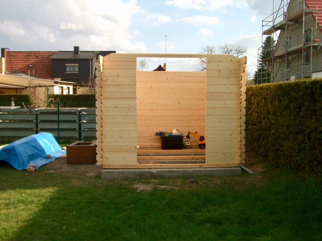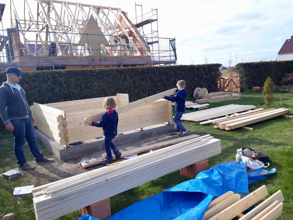 Nach tagelanger Streicherei der Einzelteile haben wir heute angefangen mit vereinten Kräften das Gartenhaus aufzubauen: Papa steht rum und gibt Kommandos, die Kinder müssen arbeiten.
