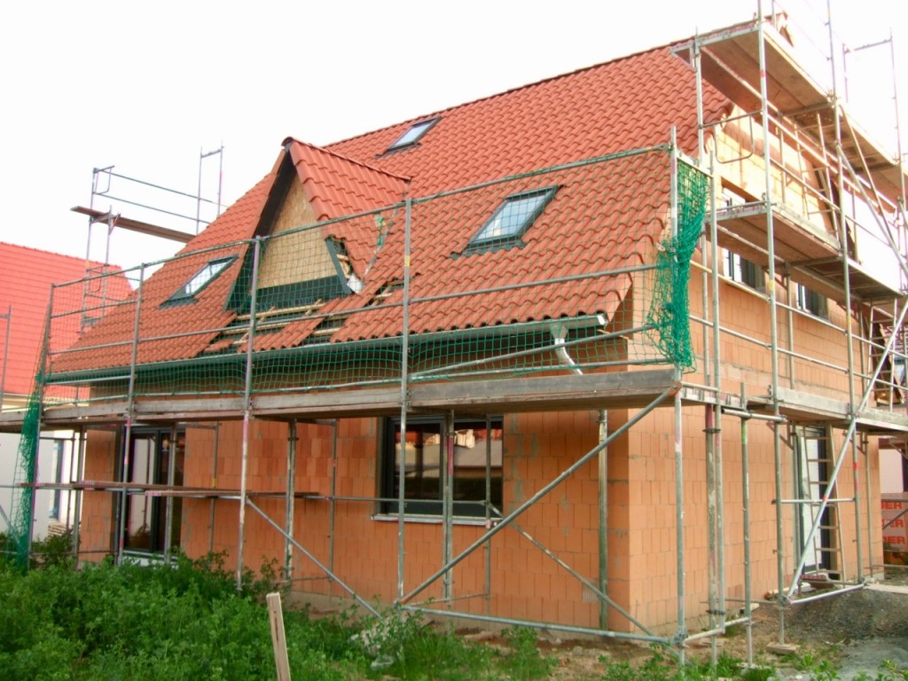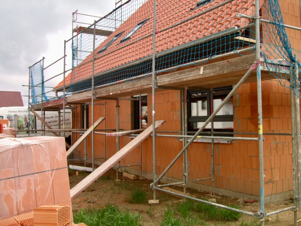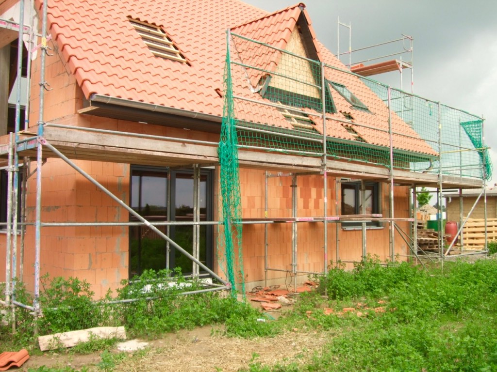 Leider fehlen noch die großen Fenster im OG und in der Gaube. Von denen wurde heute nochmal ein genaues Aufmaß genommen und die werden in den kommenden Wochen passgenau nachgeliefert.
