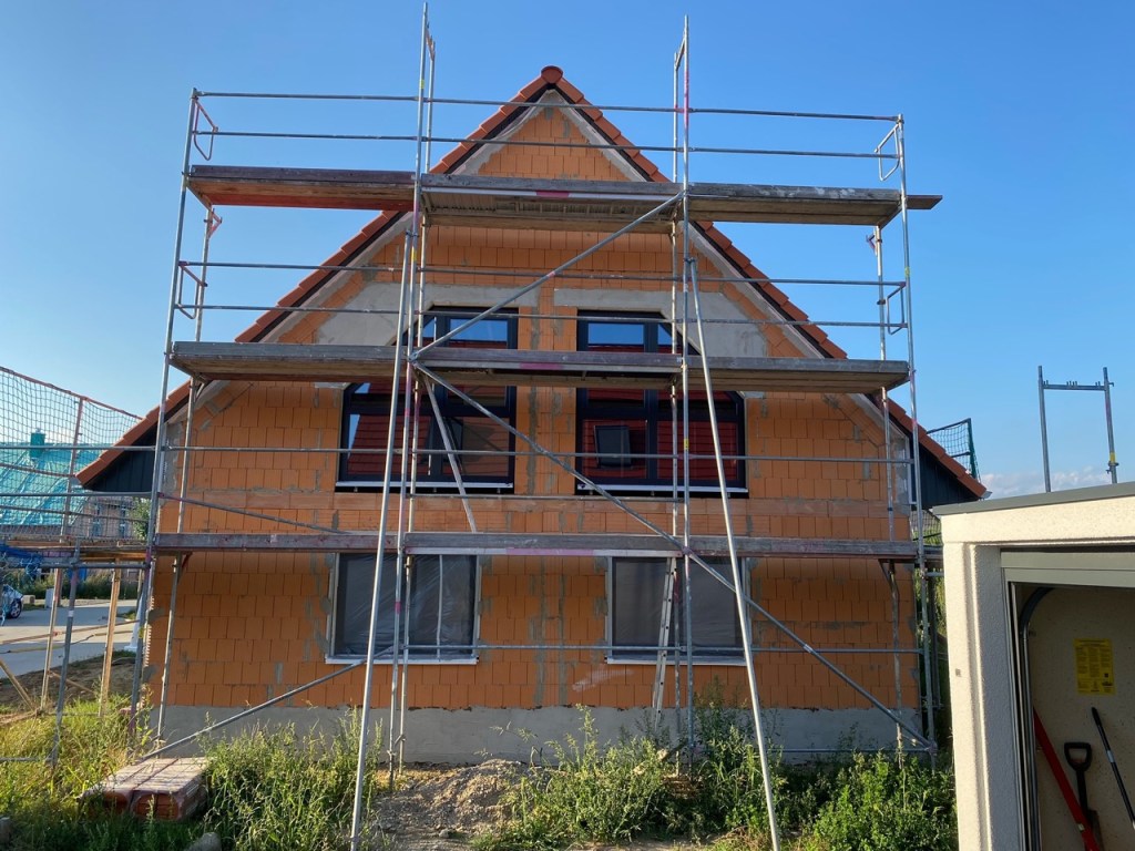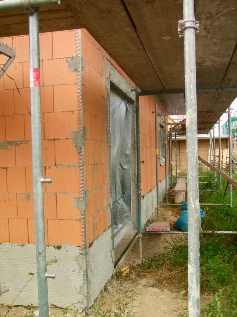 Wie man auf dem Bild sieht, wurden auch bereits Eckschutzschienen angebracht und der Sockelbereich erhielt eine Abdichtung – die Putzer stehen also in den Startlöchern…